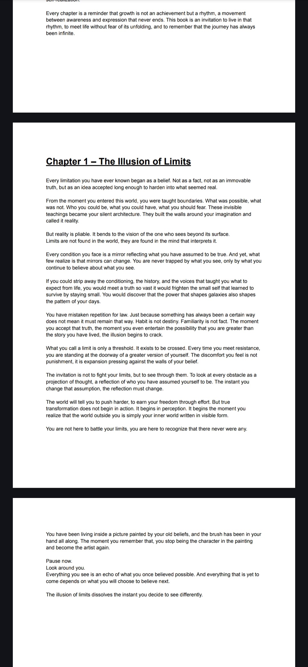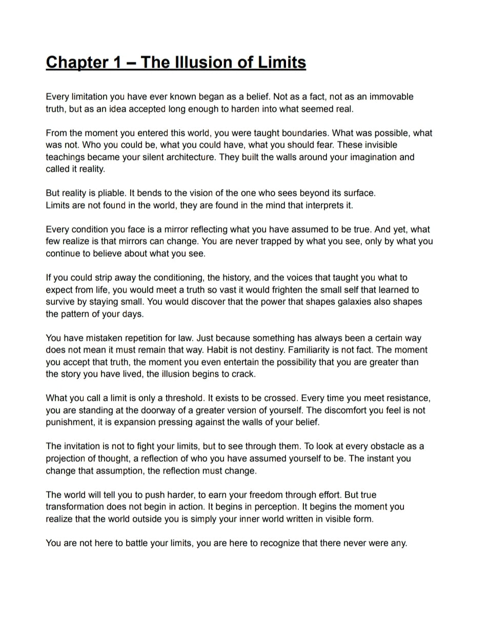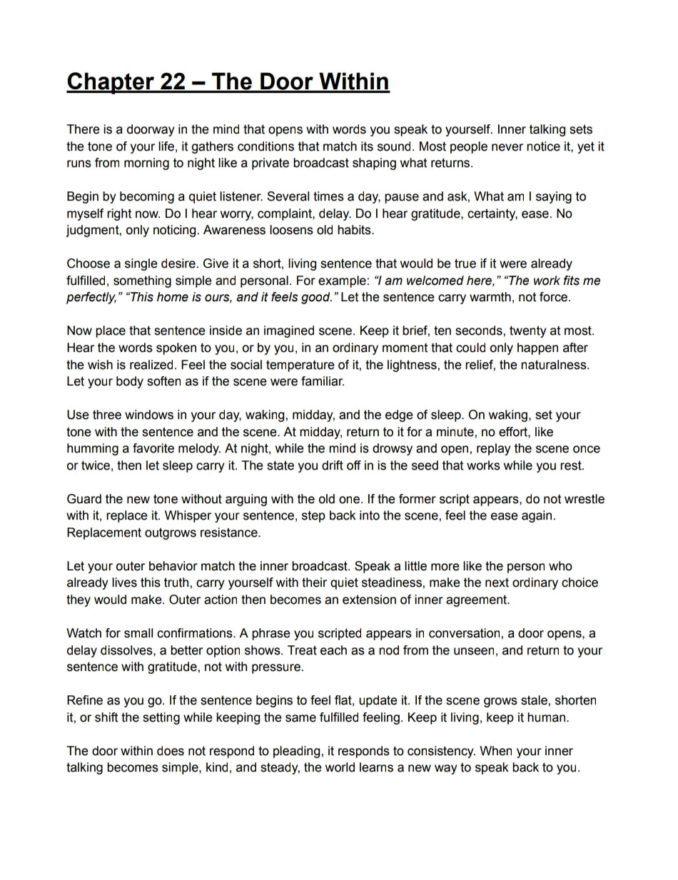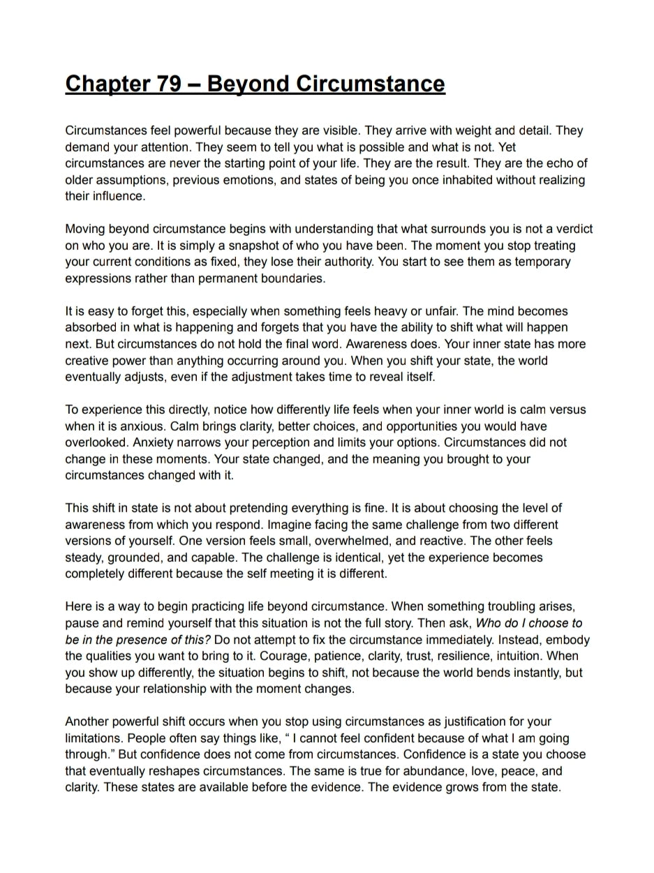 Across one hundred concise chapters, this ebook invites you to examine the beliefs you live from, the assumptions you carry, and the patterns of thought that quietly guide your results. Rather than pushing or forcing change, it focuses on shifting the inner posture from which life responds. When that shift occurs, effort softens and forward movement feels natural.
