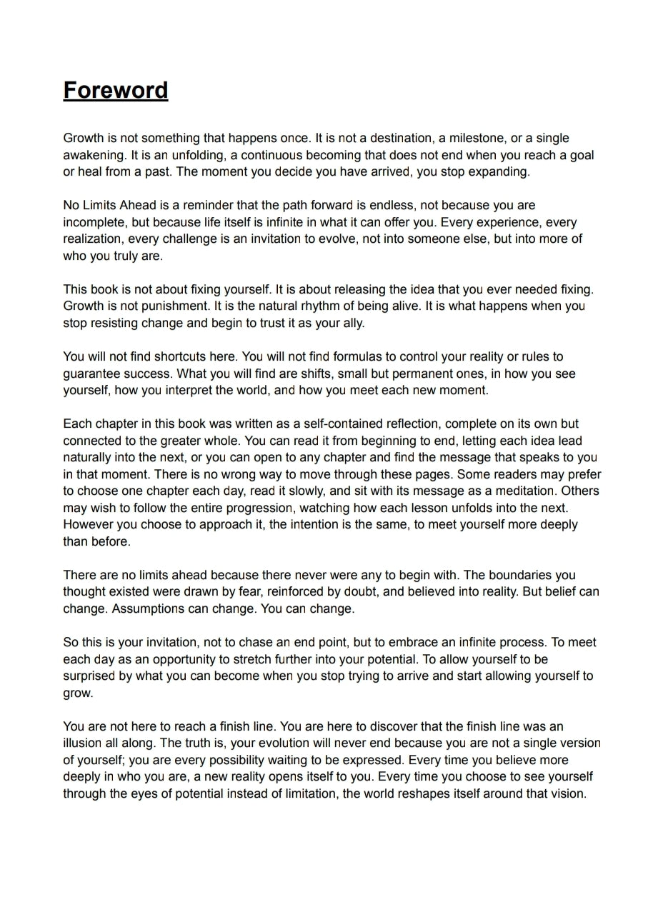 Written to be read slowly or revisited often, No Limits Ahead offers grounding reminders, perspective, and practical insight you can apply immediately. It is for anyone who senses there is more available to them, more ease, more confidence, more expansion, and is ready to step into that awareness.
